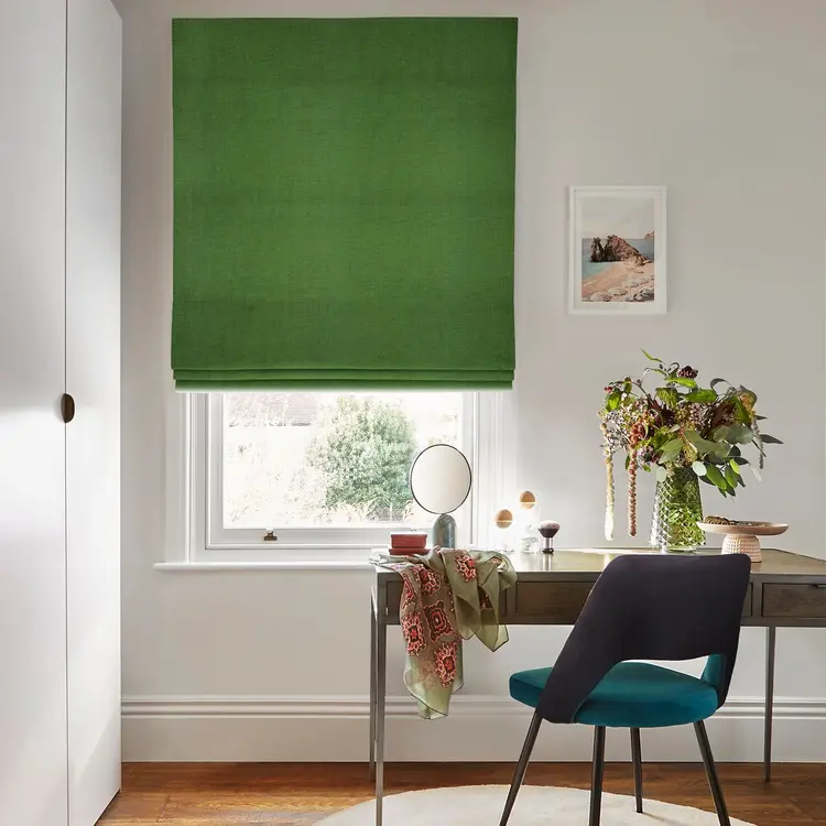 The primary product shown is a Roman Blind featuring a vibrant, nature-inspired green hue. It is designed to be a focal point in a room, offering a clean, structured aesthetic compared to traditional curtains.